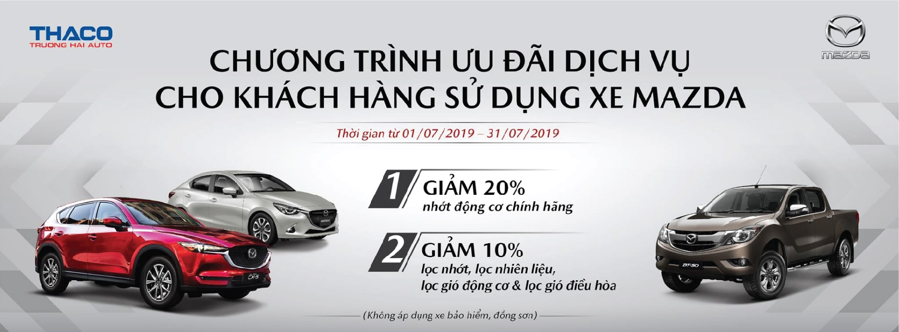 Từ ngày 01/07 đến ngày 31/07/2019, Mazda Việt Nam áp dụng chương trình ưu đãi giảm 20% nhớt động cơ chính hãng và giảm 10% lọc nhớt, lọc nhiên liệu, lọc gió động cơ và lọc gió điều hòa cho tất cả các khách hàng sử dụng xe Mazda trên toàn quốc.